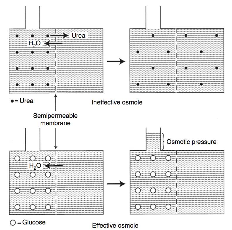 由于细胞膜对钾离子和尿素完全通透,所以产生的渗透压(摩尔浓度渗透压,摩尔渗透压)属于无效渗透压(摩尔浓度渗透压,摩尔渗透压)。