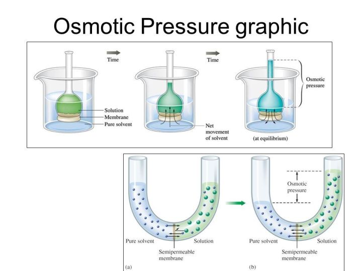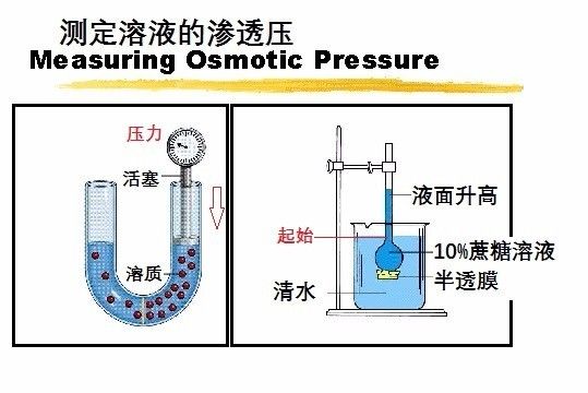 形象地说,在U型管中间安置一个半透膜,隔开清水和溶液(其溶质不可通过半透膜),清水一侧液面降低,可见水通过半透膜往溶液侧转移(即渗透),若在溶液端施加一定大小的外部压力,可刚好阻止水的渗透,则此压力即渗透压(摩尔浓度渗透压,摩尔渗透压)。