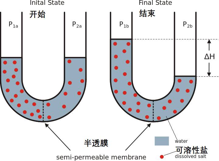 两侧液面的高度差所形成的静水压相当于盐溶液的渗透压。