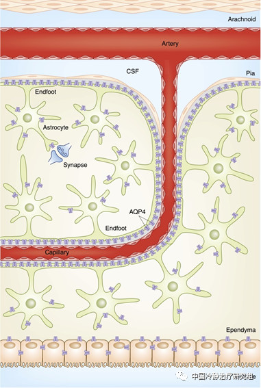 穿透性毛细血管通过蛛网膜下腔进入实质,并被星形胶质细胞包裹,星形胶质细胞除控制重要的神经功能外,还形成血脑屏障。沿着血管周隙和终足细胞膜的AQP4水通道赋予血脑屏障的透水性。AQP,水通道蛋白; CSF,脑脊液。