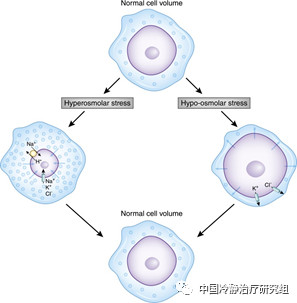 细胞通过激活膜载体蛋白和通道调节其细胞体积以应对渗透压(摩尔浓度渗透压,摩尔渗透压)的变化。在该图中,正常细胞受高渗(左)或低渗(右)环境的攻击。在高渗应激的情况下,细胞随着水的流出而收缩,然后神经元通过快速集聚Na +,K +和Cl -离子做出反应,之后细胞内产生有机溶质。然后,细胞内溶质含量的增加会促进水的吸收,使得细胞膜的浓度恢复正常,从而恢复细胞大小。低渗诱发的肿胀,激活K +和Cl -通道,以及K.+-Cl -协同转运蛋白,导致溶质和随之而来的水的丢失,从而恢复细胞体积。