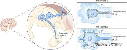 机体监测血浆渗透压(摩尔浓度渗透压,摩尔渗透压)的能力是维持水稳态的基础。正如Sharif-Naeini等人所述,已经在阐明“渗透压感受器”的机制方面取得了很大进展。特殊的神经元位于大脑的几个部位,包括(血管脉丛终端器官OVLT)和视上核,以及下丘脑的室旁核,都能够感测血浆渗透压(摩尔浓度渗透压,摩尔渗透压)变化,并作出复杂的神经元命令。来自大鼠下丘脑视上核的电生理记录表明,缺水时,细胞去极化的发生率增加,而补充液体后(发生率)降低。最近的研究表明,高渗透压(摩尔浓度渗透压,摩尔渗透压)通过激活非选择性钙阳离子通道引起渗透压感受器膜的去极化是与细胞脱水相关的特定细胞内溶质的变化,还是与细胞膜收缩相关的机械效应,谁是准确的刺激,仍然有些未能解决。瞬时受体电位香草酸(TRPV)阳离子通道家族作为一种可能“机械 - 拉伸”受体,有力地支持了渗透压监测是一种机械过程的概念(图3),并且其多态性都与低钠血症有关。OVLT神经元的收缩,无论是因为脱水或负性吸引力,都是通过TRPV1 来刺激细胞而活化的。细胞体积在神经元活化中的重要性,可以解释为什么穿过细胞膜的无效渗透物质,例如尿素和葡萄糖(在胰岛素存在下)不会激活渗透压感受器。渗透压感受器,可能是因为它在协调保水途径中的作用,会减轻调节性体积减少的效应,由此保持高渗性引起的自身收缩,由于持续存在的刺激口渴和加压素释放直至血浆渗透压(摩尔浓度渗透压,摩尔渗透压)得到纠正。在接下来的部分中,我们将讨论渗透压感受器如何调节口渴和加压素(同义称为抗利尿激素)的释放。