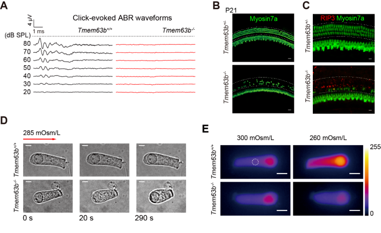 TMEM63B敲除导致小鼠耳聋。A.听力脑干反射(ABR)在TMEM63B敲除的小鼠完全缺失,表明小鼠没有听力。B. 在TMEM63B敲除的小鼠耳蜗,外毛细胞大量丢失。C.这些外毛细胞死于程序性死亡,RIP3信号表明necroptosis细胞死亡途径激活。D.在给与微弱的低渗处理时(从300mOsm/L降到285mOsm/L)时,正常外毛细胞形态维持不变。而TMEM63B敲除的细胞快速膨胀变圆。E. 正常外毛细胞在低渗处理时,胞内钙信号增强,敲除细胞胞内钙信号不变。