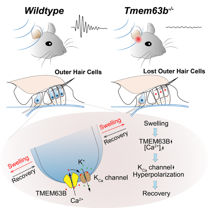 TMEM63B保护听觉外毛细胞的机制示意图。Tmem63b基因敲除小鼠对声音完全没有反应。它们耳蜗内外毛细胞全部丢失,原因是缺少TMEM63B后,外毛细胞会持续膨胀,形态无法维持。